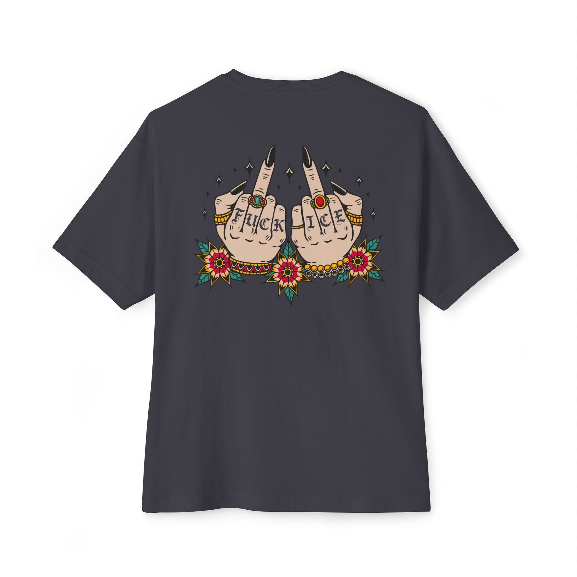 The front Chinga La Migra; the back bursts with tattoo-inspired art — two hands giving the finger framed by floral accents and dotted stars "FUCK ICE". The relaxed, dropped-shoulder cut and medium-weight cotton feel like your go-to for streetwear days, protests, late-night patrols, or backyard gatherings.  Wear it when you want your style to speak first: raw, unapologetic, and a little vintage-gritty.
