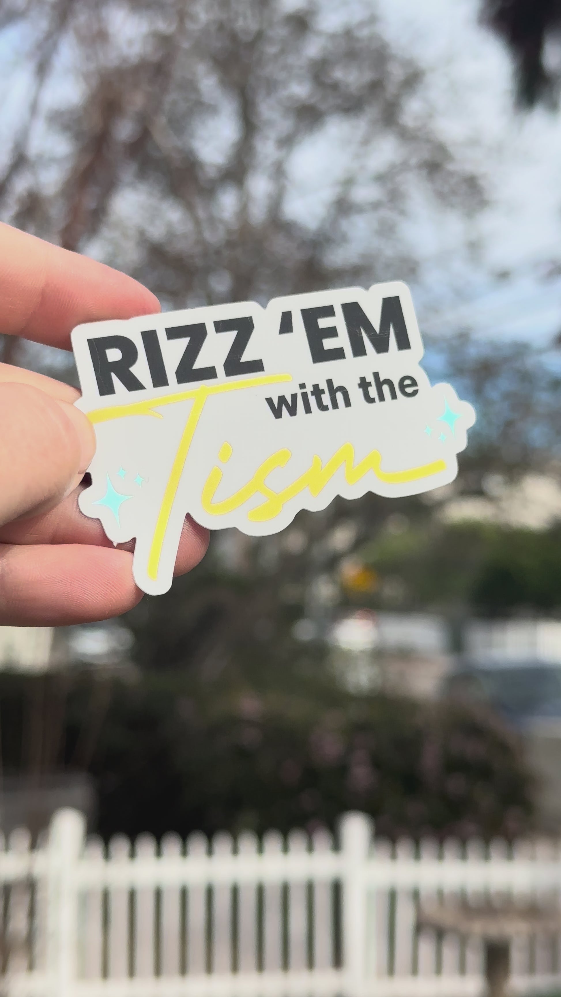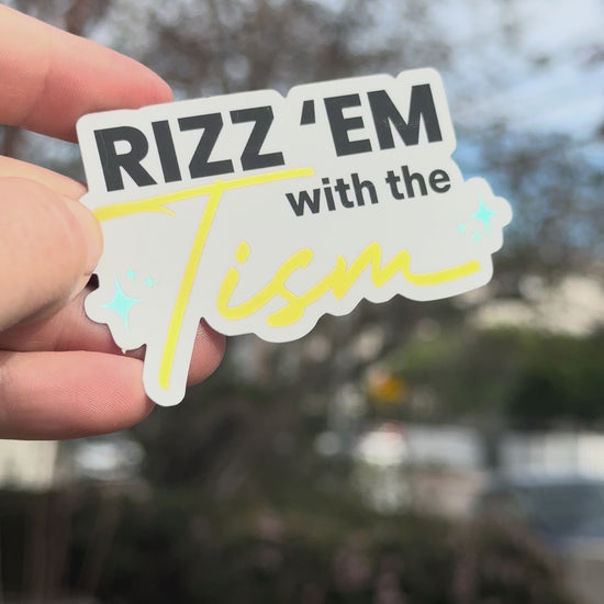 Rizz em with the tism matte sticker with gold and shiny teal sparkles. Win people over with your ✨ charisma and charm ✨ 3 x 2 inches