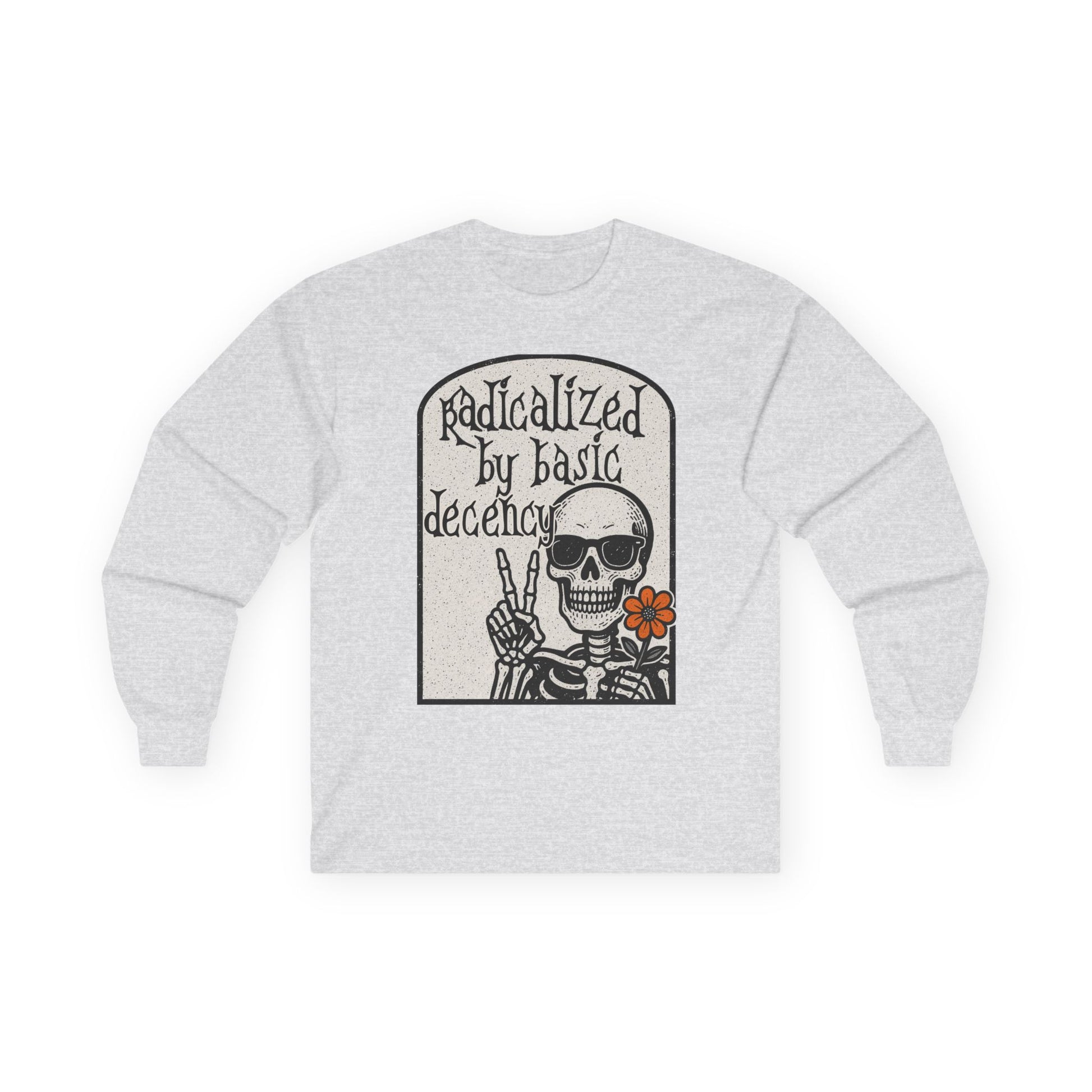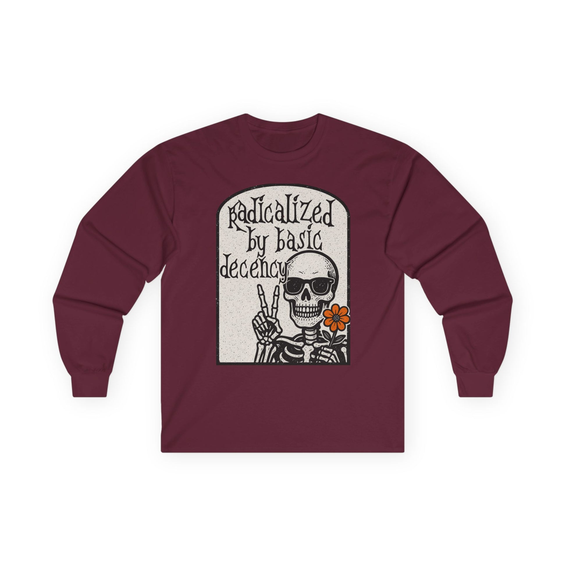 Radicalized By Basic Decency Long Sleeve. Made from environmentally-friendly cotton, this shirt offers a thicker vintage feel, perfect for casual outings or cozy nights in. Its classic fit and ribbed collar provide a stylish silhouette that complements any outfit, making it an essential addition to your closet. Ideal for anyone who loves to express their personality through fashion, this tee is perfect for gifting during celebrations, holidays, or just as a treat for yourself. Wear it on casual Fridays, festive gatherings, or laid-back weekends, and let your wardrobe reflect your unique vibe!